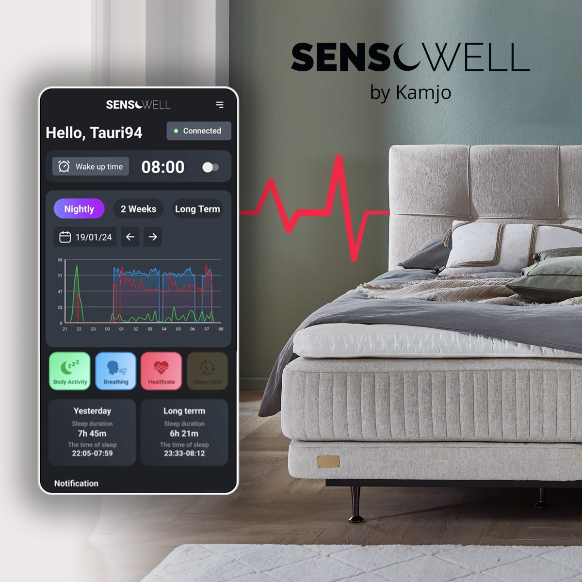 Hyvä uni on terveytesi ja hyvinvointisi perusta – se vaikuttaa suoraan mielialaasi, energiatasoosi ja yleiseen terveydentilaan. Sensowell by Kamjo on uudenlainen unianturi, joka seuraa ja analysoi untasi, sykettäsi ja hengitystäsi lääketieteellisellä tarkkuudella ilman, että sinun tarvitsee käyttää älylaitetta tai aktiivisuusmittaria. Nuku vain rauhallisesti, ja Sensowell hoitaa kaiken muun ja tarjoaa markkinoiden yksityiskohtaisimmat unitiedot. Muuta untasi pienin askelin ja nauti **levänneestä ja raikkaasta olosta** joka aamu!